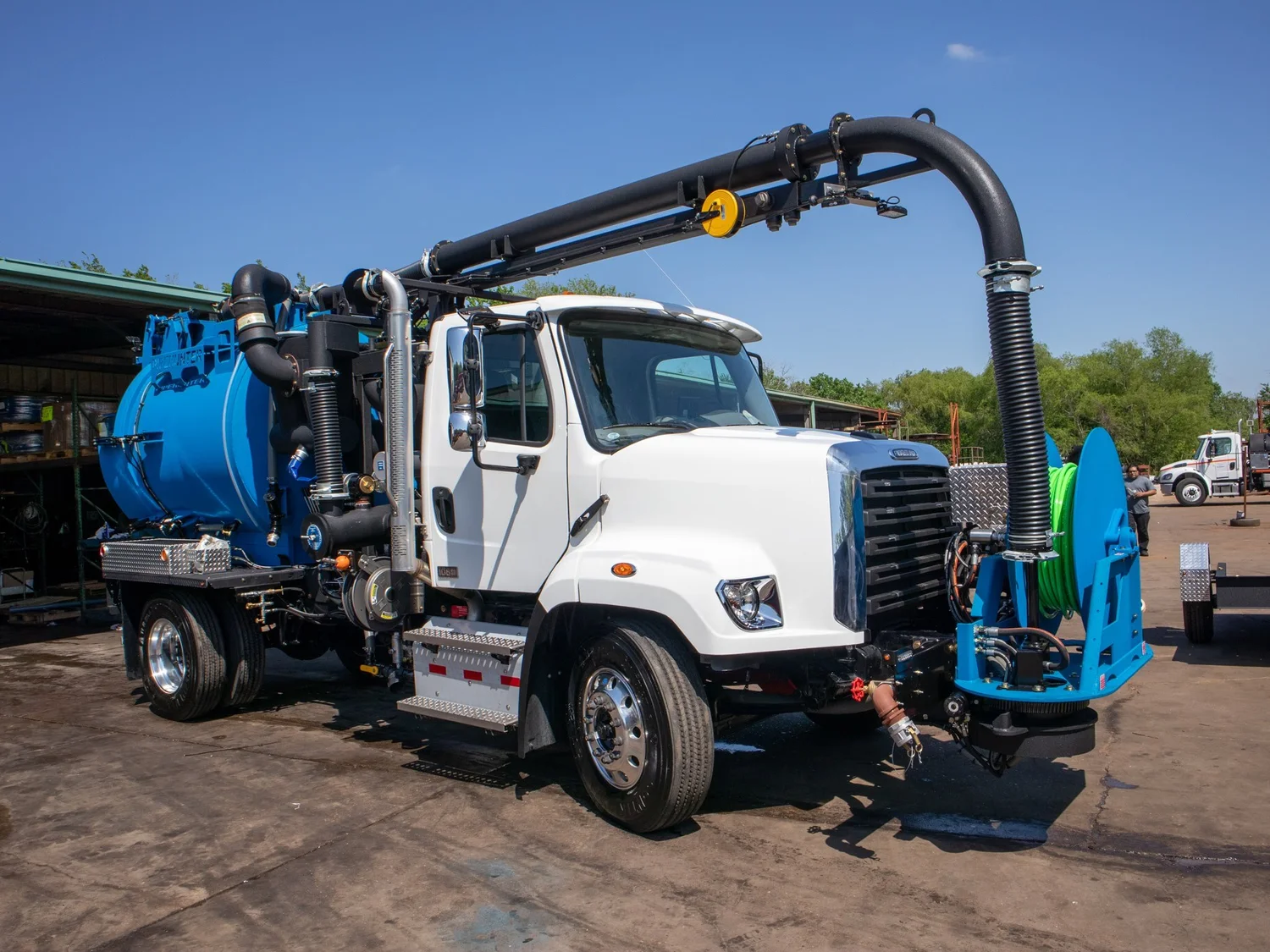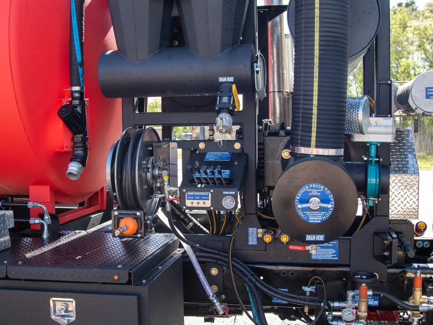 We have revamped the original NON-CDL combo Vacuum truck and introduced a single barrel design that includes both your debris and water tanks. The 600 Gallon Water TAnk remains an industry leader on the non-cdl combo market but now also features a stainless steel build. A stainless steel wall separates your debris and water tank. With the saddle tanks no longer possessing valuable real estate along the edge of the truck, tool trays are available along both sides for storage.