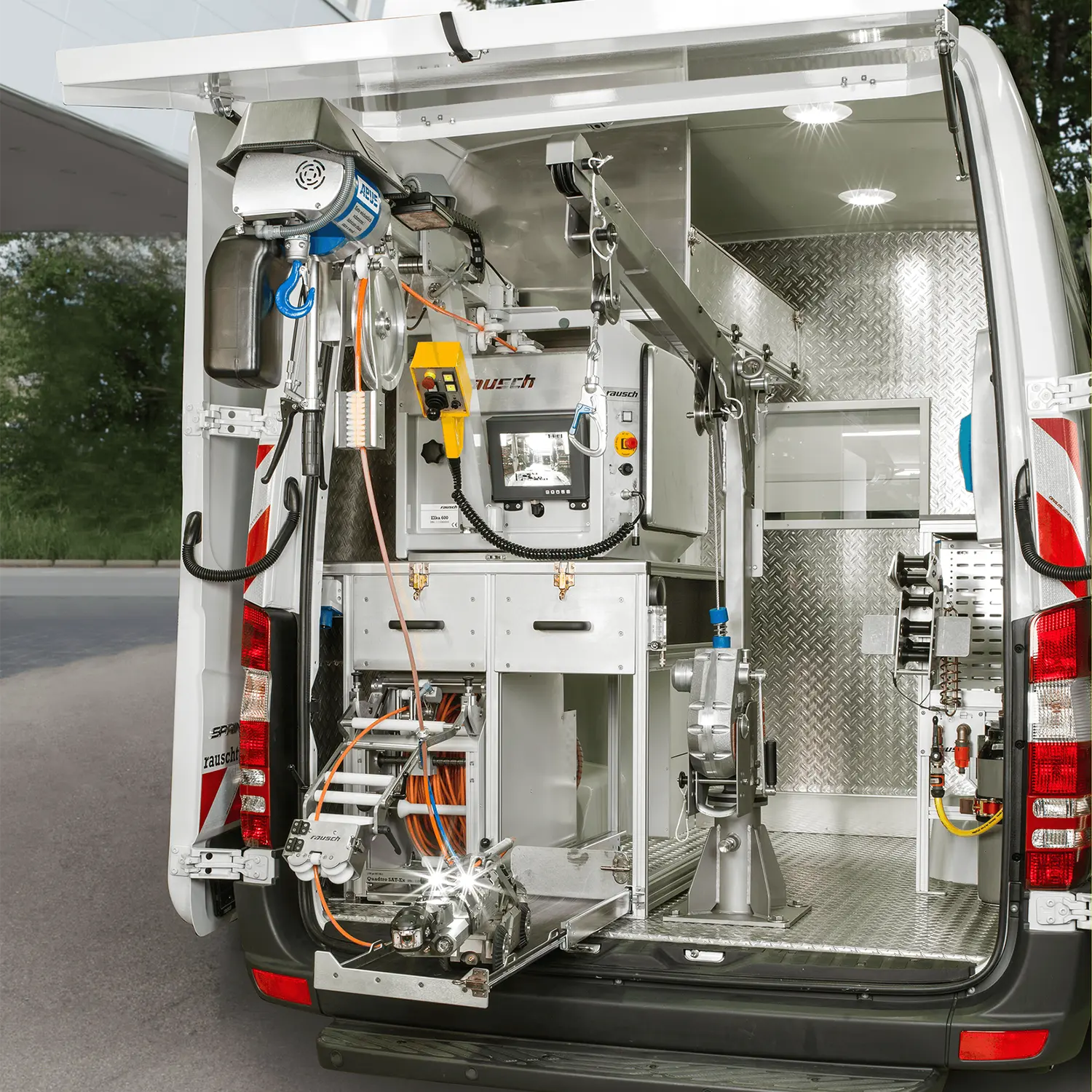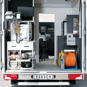 The fully synchronized built-in premium model Elka 600 is integrated in the rear area of the CCTV inspection vehicle to save space. Elka 600 – the fully equipped cable drum can be used in conjunction with the Rausch-Tab control unit with up to 300 m of camera cable.