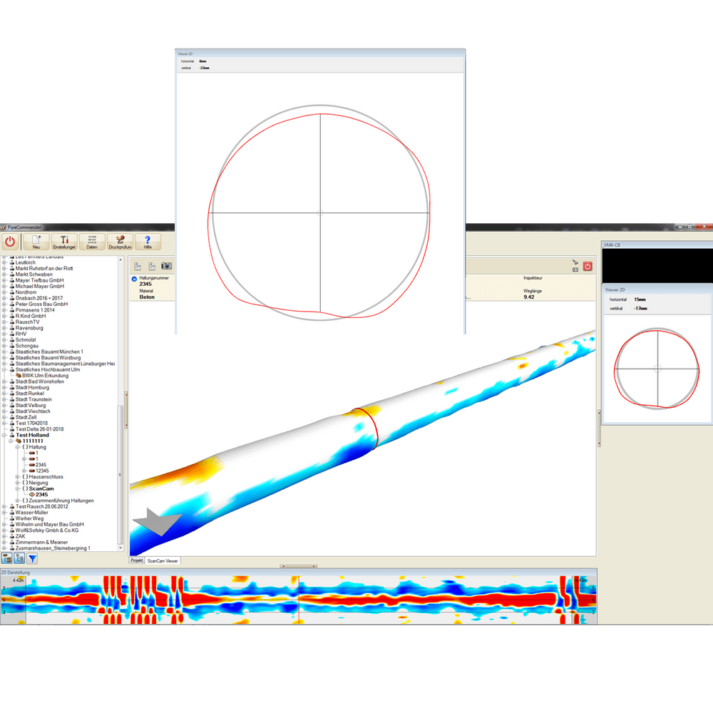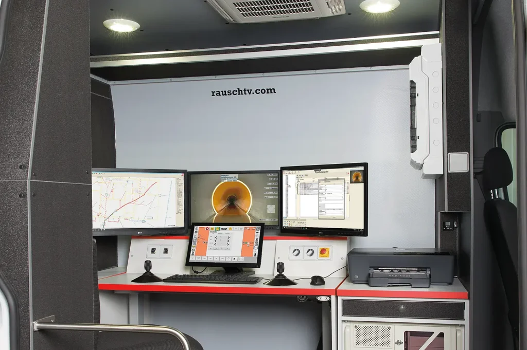 Must-haves such as digital overlay technology for displaying measured values and data in different country versions, system control via an industrial PC with a 15″ touch screen, 24″ video monitor in Full HD ensure exact recording and documenting inspection and two multifunctional joysticks for camera and crawler operation.