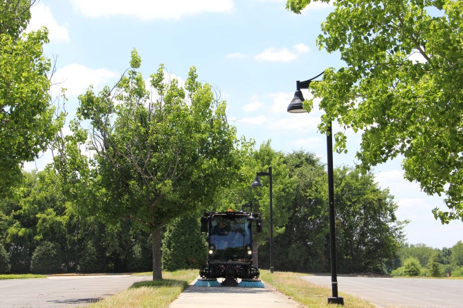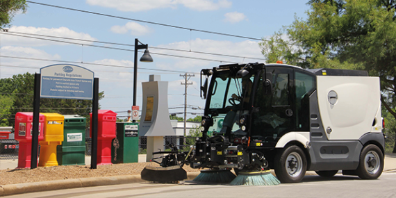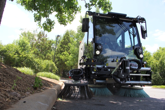 Agile in the city. A short overhang and selectable 2 and 4 wheel steering, with a patented auto-steer system, helps the operator sweep in tight spaces. This system also makes the transition from sweeping to transit easy.
